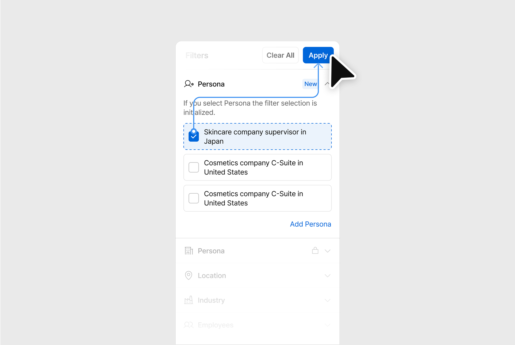 페르소나 필터는 사용자가 선택한 필터를 저장하여, 이를 선택하면 자동으로 필터가 적용되는 방식으로 작동합니다. 이는 반복적인 필터 설정 작업을 줄여줄 뿐 아니라, 리드 발굴을 사용자 맞춤형으로 더 효율적으로 수행할 수 있게 합니다.