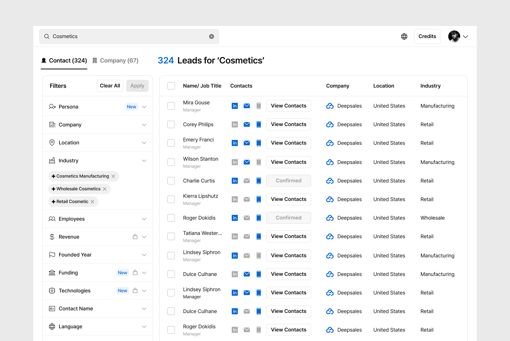In the previous version of DeepSales, users could use an AI-based search bar on the main page, with filters like employees, revenue, and contacts available on the left panel. However, a significant limitation was the inability to apply filters while performing keyword searches simultaneously. Additionally, the platform’s “Featured” filters were insufficient for offering personalized industry recommendations.